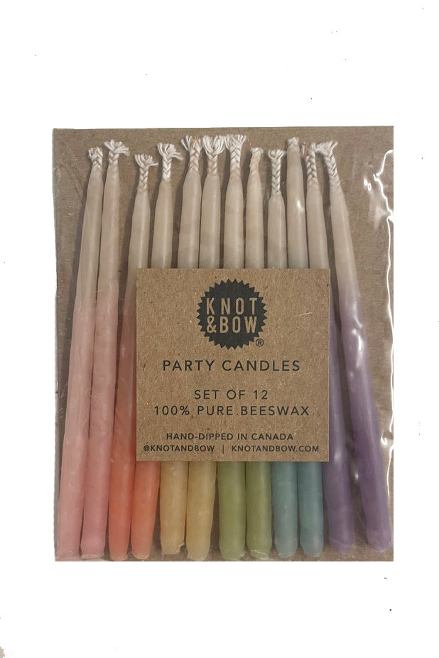 A joyful mix of twelve hand-dipped beeswax candles in delicate, pastel hues.